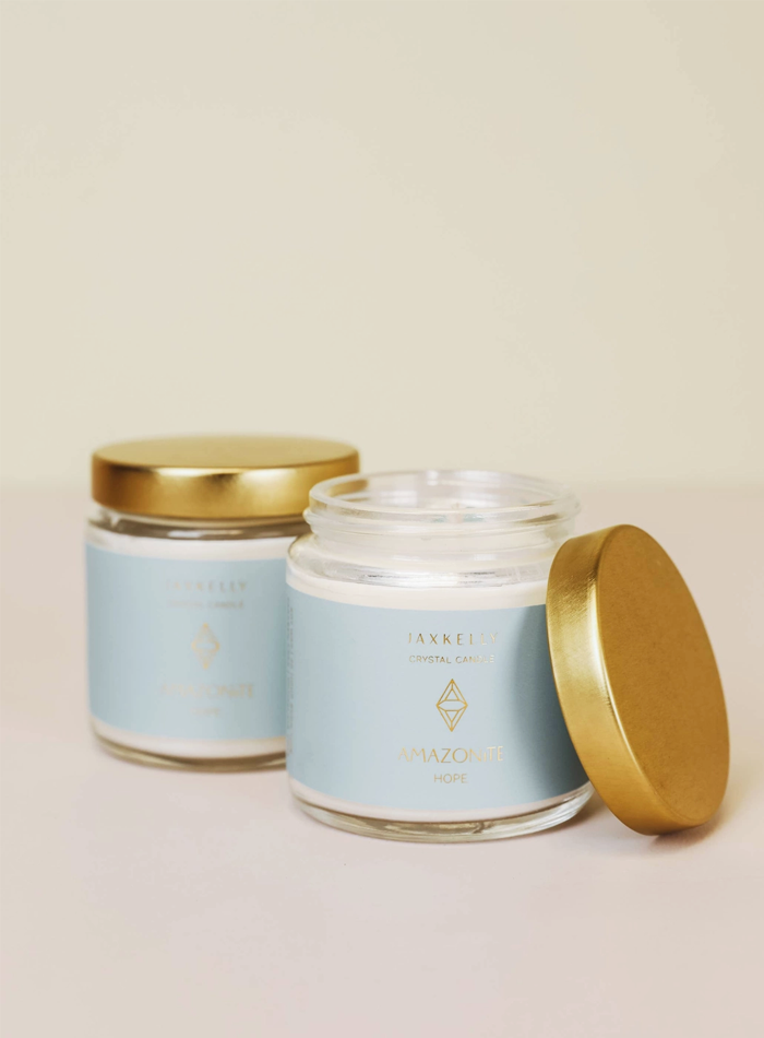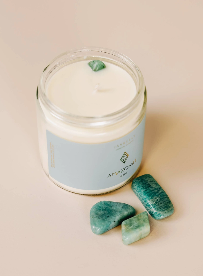 Features: 100% American-grown soy wax Crystal. Natural Amazonite. Free of Parabens, Phthalates, and harmful chemicals Hand-poured in San Diego, CA