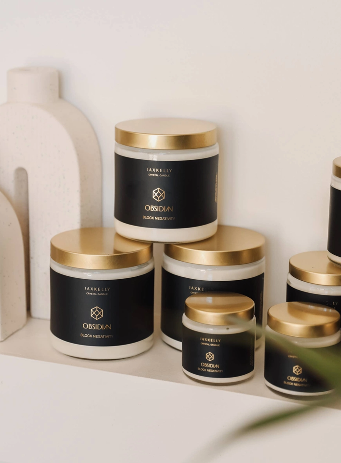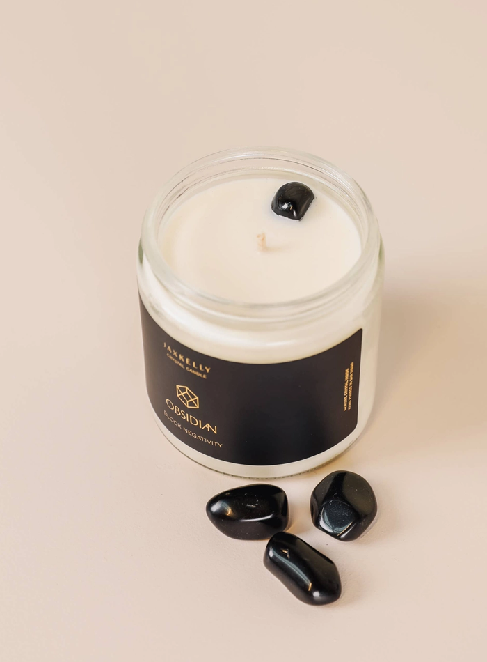 Clean, American-grown soy wax Natural Obsidian crystal inside. Free from harmful additives. Poured by hand in San Diego, CA