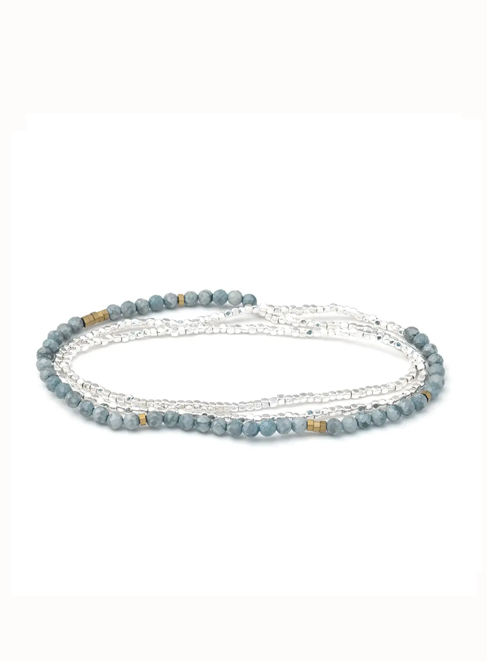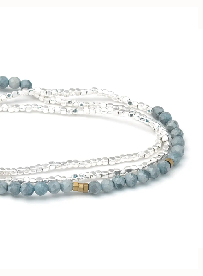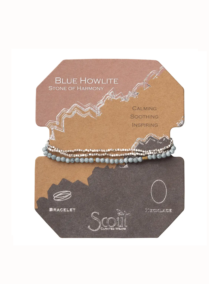 This wrap bracelet unravels and can be worn as a single strand necklace. Featuring Blue. Howlite, a stone of Harmony, these gemstones mix with tiny geometric metal beads to create a subtle and magical piece.